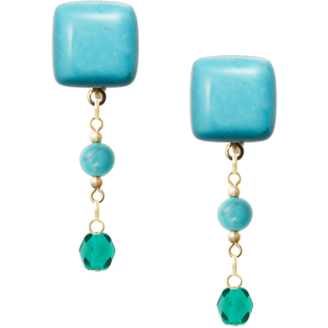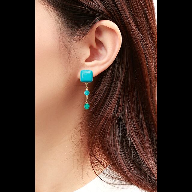 アクリルと真鍮を組み合わせた、ターコイズブルーのイヤリングです。天然石のチェコビーズやファイヤポリッシュを使用し、エメラルドグリーンの輝きが美しいデザインとなっています。12月の誕生石にちなんだ色合いで、ゴールドとブルーのコンビネーションが上品な印象を与えます。
