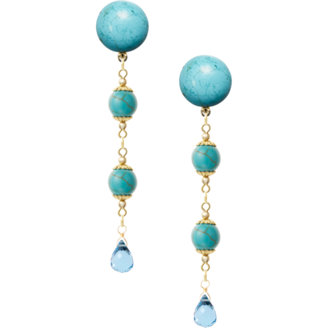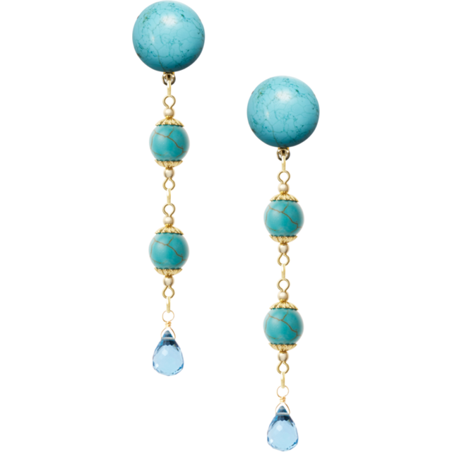 ターコイズブルートパーズと天然石ドロップを組み合わせた、ゴールドとみずいろのアクリルイヤリングです。12月の誕生石であるターコイズと11月の誕生石であるブルートパーズが美しく輝き、上品な印象を与えます。真鍮素材の丸いパーツがアクセントとなり、ハンドメイドの温かみが感じられるデザインです。サイズは程よく大きめで、耳元を引き立てる存在感があります。