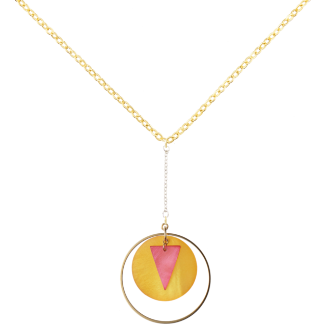 商品説明: ゴールドの真鍮チャームと丹銅色の変形チェーンが、エレガントな雰囲気を演出するネックレス。オレンジのシェルがアクセントとなり、個性的で魅力的なデザイン。三角形と丸のシェルがユニークな組み合わせを作り出しています。