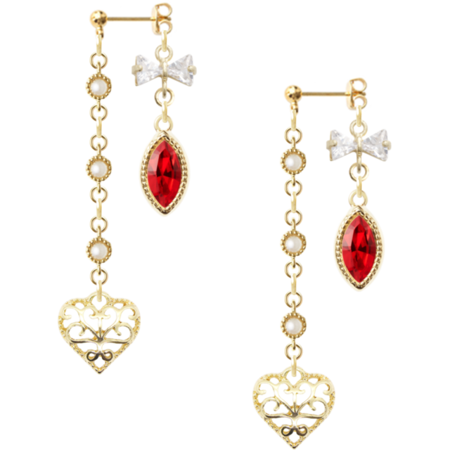 この大人向けの小ぶりなパールピアスは、高品質の真鍮素材を使用しており、ゴールドと白のメタルパーツが上品さを演出します。さらに、ラインストーンやスワロフスキーが施されており、華やかさも兼ね備えています。リボンや変形デザインが個性的で、ライトシャムの赤いアクセントがポイントです。