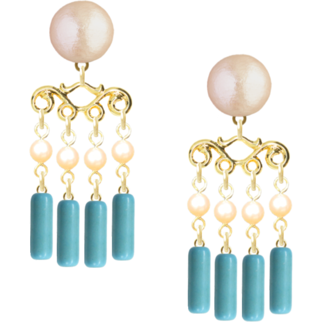 素材は、高品質なゴールドと天然石のターコイズ、あこや真珠、コットンパールを使用しており、上質な仕上がりが特徴です。ピンクカラーのパールが柔らかな印象を与え、肌なじみが良く、洗練された印象を与えます。