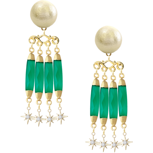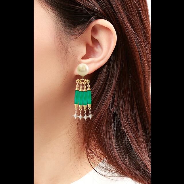 圧倒的な存在感を持つ「エレガントオニキスピアス」は、天然石オニキスとゴールドの美しいコントラストが魅力のピアスです。天使の羽のように軽やかなコットンパールと、華やかなラインストーンが施されたデザインで、フォーマルな場にもカジュアルな日常使いにもぴったりです。夏や春の装いに彩りを加え、キラキラと輝くことで、特別感を演出します。