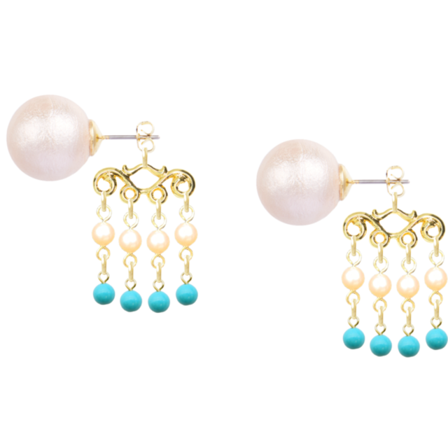 このピアスは、ゴールドの素材を基に、ターコイズの青とホワイトパールのコントラストが独特な印象を与えます。サイズは小ぶりですが、存在感があり、様々なシーンにマッチするデザインになっています。