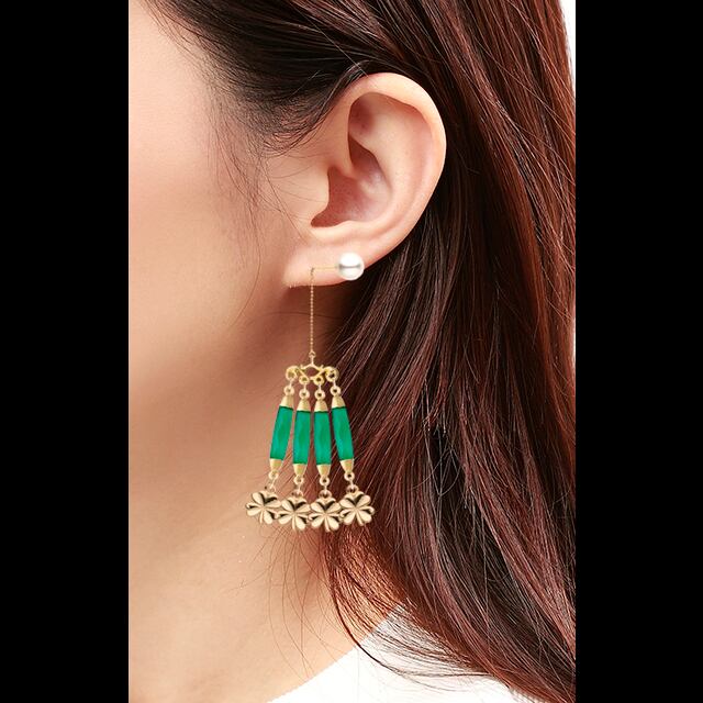 こちらのピアスは、艶ありゴールドの高級感と天然石のオニキス、パールが組み合わさり、春夏のファッションにぴったりのアクセサリーです。フォーマルからカジュアルまで、さまざまなスタイルにマッチします。シンプルなワンピースやシャツに合わせることで、エレガントさを引き立てることができます。
