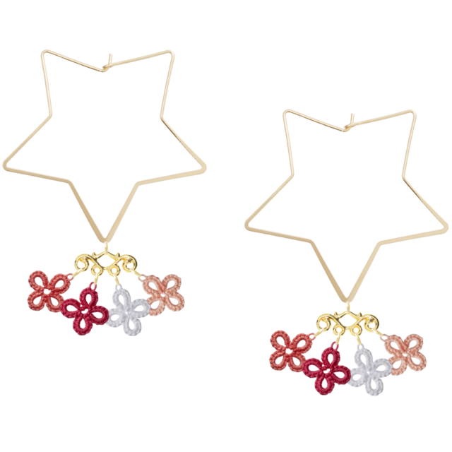 お買い上げいただき、ありがとうございます!nagicocoの厳選した素材で作られた、春らしいタティングレースの花ピアスをお届けします。この大ぶりでツヤ感のあるデザインは、お洋服に華やかさをプラスしてくれること間違いなしです!真鍮素材の星やゴールドの装飾が、さらにおしゃれさを引き立てます。