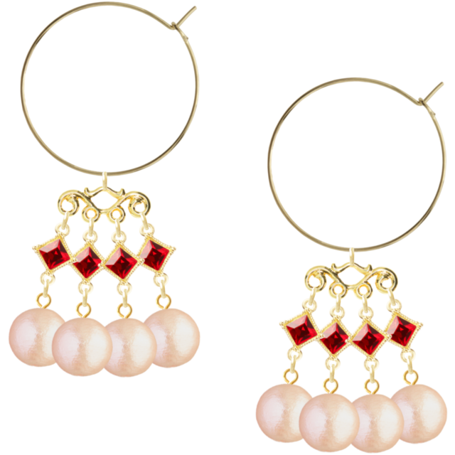 ショッピングモールcoconaをご利用いただき、ありがとうございます。当店からは、スワロフスキーを使用した真鍮製のひし形ピアスをご紹介いたします。ライトシャム色のスワロフスキーと赤いパール、ピンクのコットンパールが上品な印象を与えるデザインとなっております。丸い形状のフープがゴールドで飾られており、個性的でありながらも上品さも兼ね備えたピアスです。