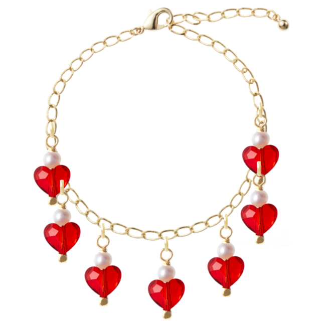 ショッピングモールcoconaをご利用いただき、ありがとうございます。このブレスレットは、スワロフスキーやパールを使用した見た目も華やかなアイテムです。ライトシャムの赤と白のコントラストが美しく、真鍮の変形デザインが特徴です。ゴールドのアクセントにより、年齢を問わずお使いいただけます。