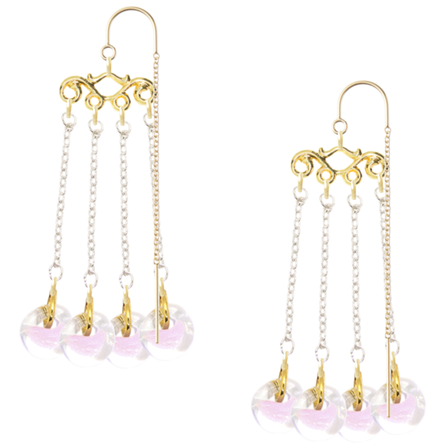 * **デザイン**: 不規則な形のゴールドフィルドと、光を反射するガラスビーズの組み合わせが、耳元を華やかに彩ります。