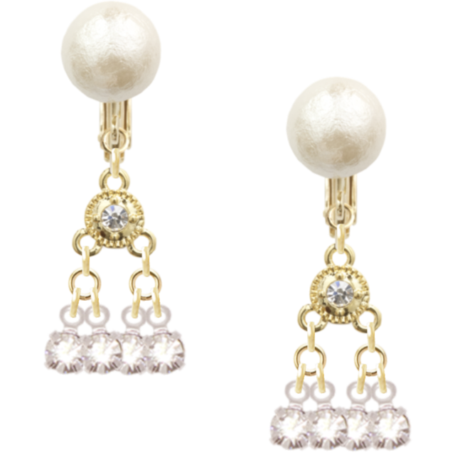 素材は真鍮を主に使用し、ゴールドやクリアなラインストーン、コットンパールが用いられています。サイズは程よい大きさで存在感がありつつも重たくなりすぎないデザインです。イヤリングの仕様は金属パーツやチェーンが繊細に組み合わさり、高級感とエレガンスを演出しています。