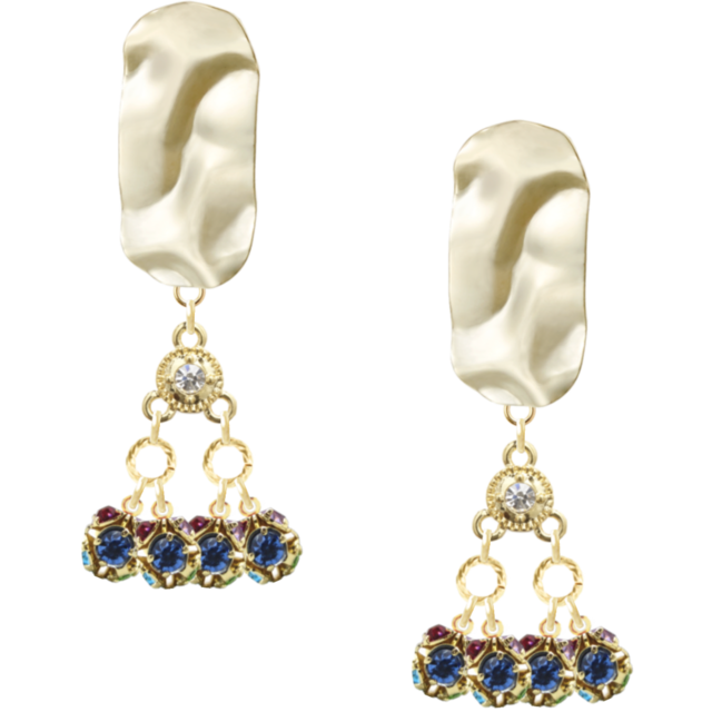 真鍮製の変形ゴールド丸型パーツに、キラキラ輝くミラーボール、様々なカットのストーン、ガラスビーズ、ラインストーン、メタルパーツを贅沢に組み合わせた、ゴージャスなピアスです。光を反射して、耳元で華やかに輝きます。