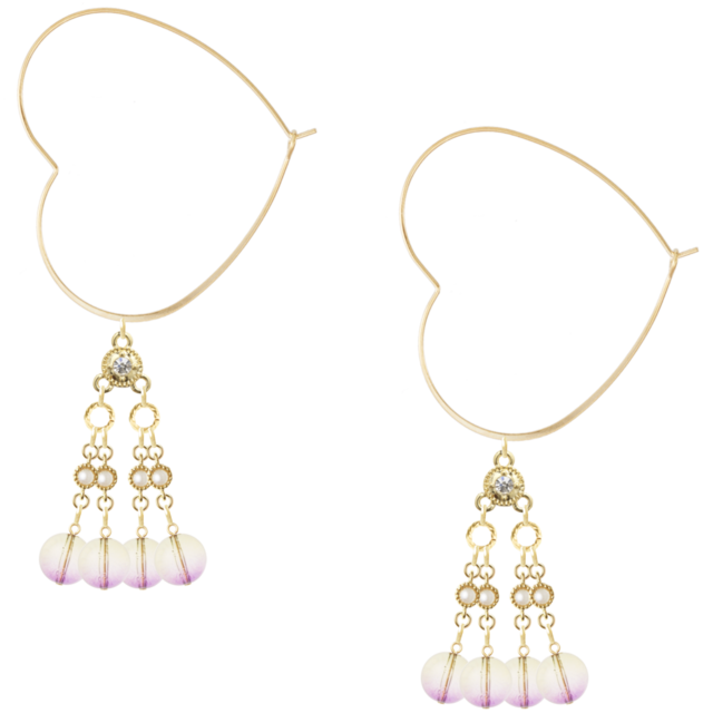 真鍮製のゴールドハート型パーツに、上品なホワイトパール、煌めくラインストーン、クリアなクリスタル、そしてアクリル製のパステルカラーパーツ(紫、黄)を組み合わせた、大人可愛いピアスです。小ぶりなサイズ感で、普段使いにもおすすめです。