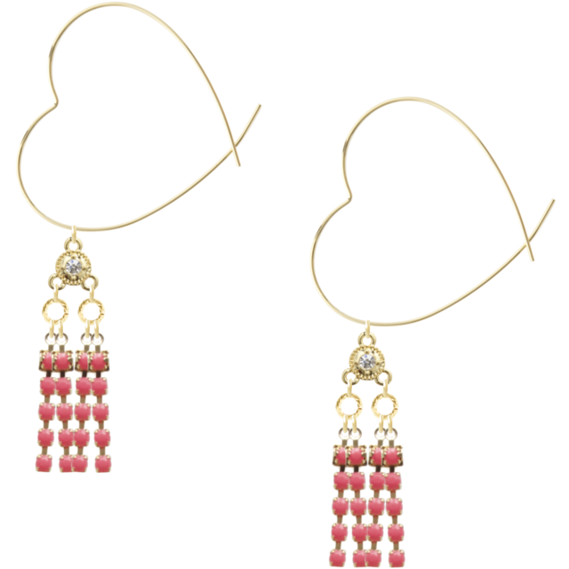 当店のアクリルチェーンピンクラインストーンゴールドピアスは、華やかでエレガントなデザインが特徴のアクセサリーです。ピンクラインストーンとクリアクリスタルが煌めき、ゴールドのフープとハートが可愛らしさをプラスしています。