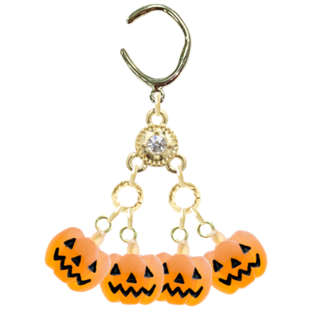 10月にぴったりのハロウィンシーズンに向けて、プラスティック素材で作られたおばけやカボチャのモチーフが描かれた、オレンジ色のイヤーカフが登場しました。エレガントでありながら遊び心も感じるデザインで、大人の女性やセレブリティにおすすめのアクセサリーです。丸い形状にゴールドの装飾が施され、ラインストーンやクリスタルのクリアな輝きが華やかさを引き立てます。