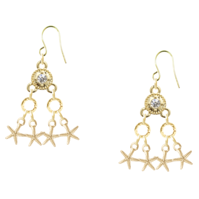 ステンレス製のノンニッケルフックピアスに、真鍮製のゴールド丸型パーツ、ヒトデモチーフ、煌めくラインストーン、クリアなクリスタルを組み合わせた、アレルギー対応のピアスです。