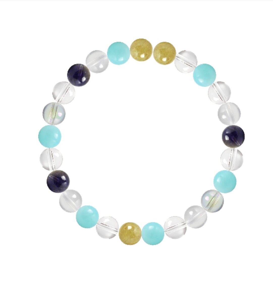 静かな朝の光が、手首の上でそっと巡るように。透明・ミント・濃紺・金色の光が均等に散り、大人の毎日にやわらかな華やぎを添えるブレスレットが仕上がりました。